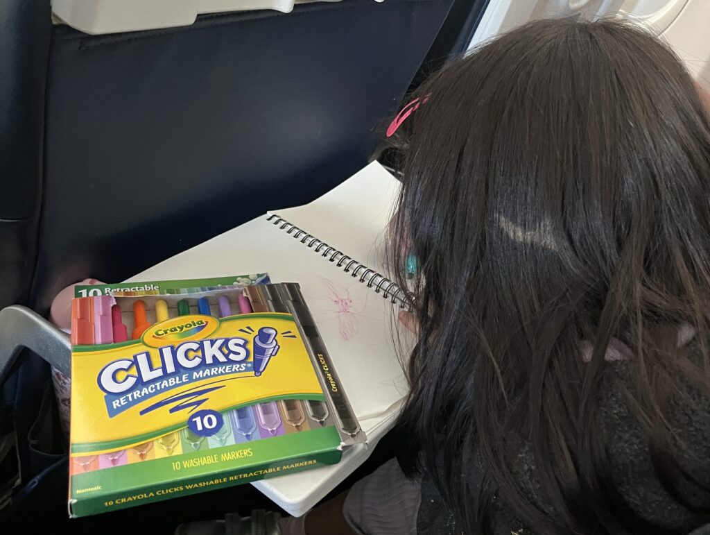 - Markers: These Crayola Clicks retractable markers are perfect for travel. No cap to be lost and they don’t dry out easily. It takes a bit of strength to push the markers open, but my 4 year old can do so by herself easily (2 year old needs help still). And I can attest that they are, in fact, washable.